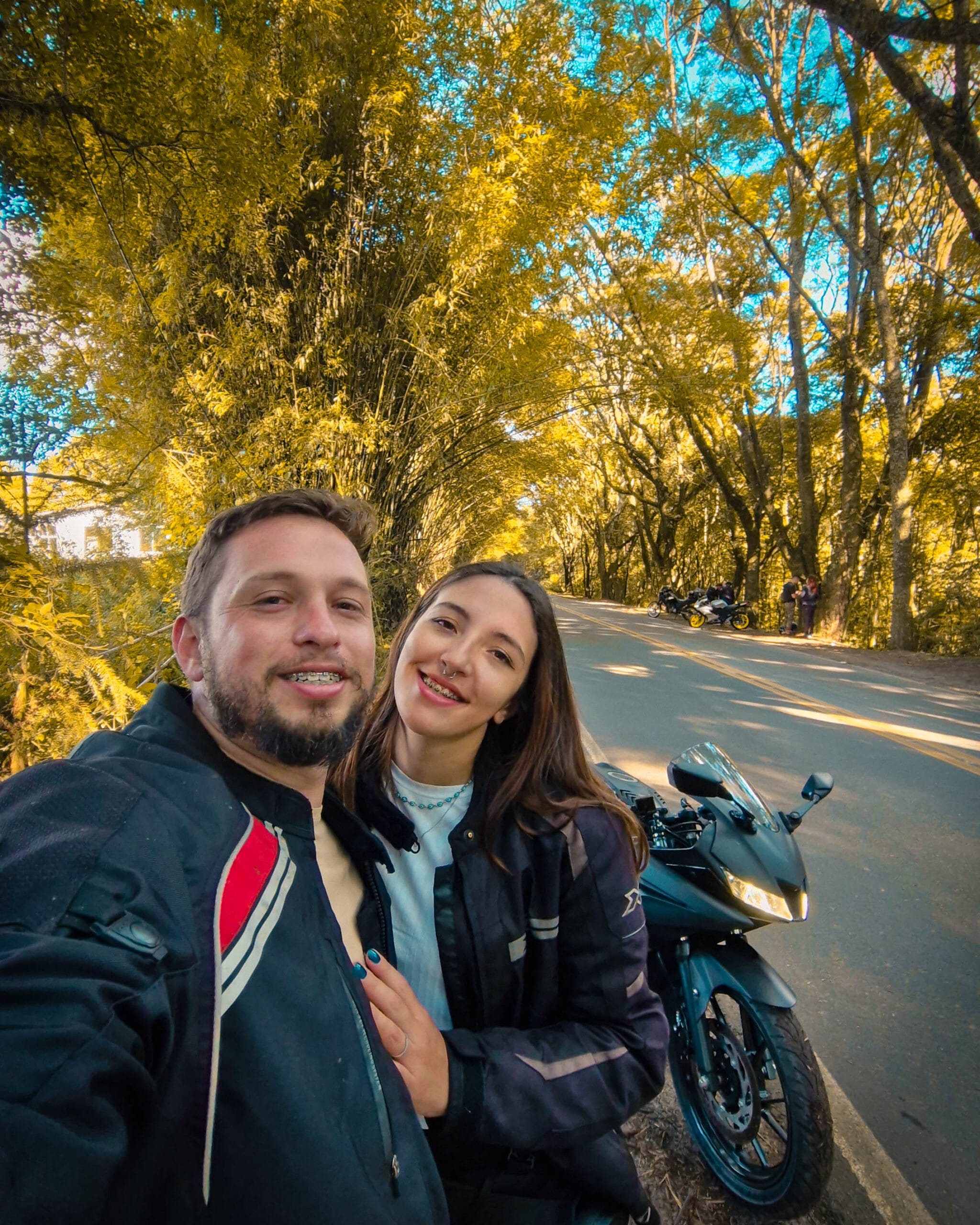 Depois fomos visitar o famoso Túnel de Árvores Entrelaçadas, na verdade é um túnel de bambus que cresceu formando uma cobertura sobre a estrada. Lugar lindo e super fotogênico, todo mundo tirando fotos, inclusive a nossa turma. Vale muito para quem busca um roteiro de moto com pontos instagramáveis no Paraná.